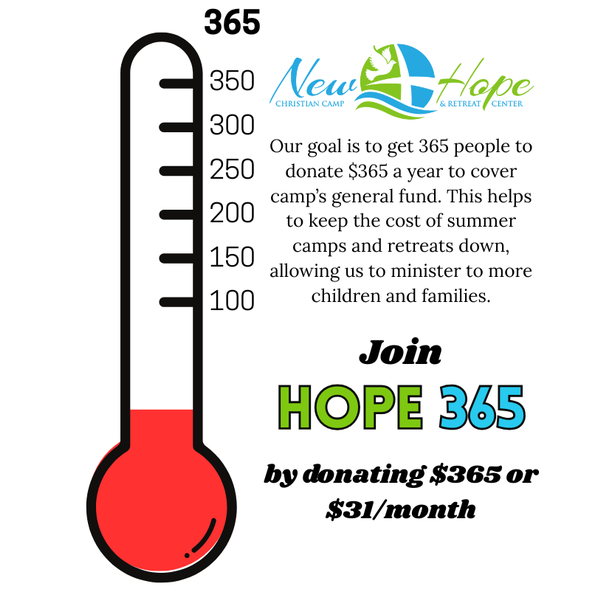 Camps Retreats Donate Volunteer Join Hope 365! Join us in helping to support camp by donating a dollar a day, or $365 a year. It is your ongoing support that keeps us ... read more Winter Day Camp 2025 Join us during Christmas vacation for 4 days of fun and learning “How to Train Your Attitude!” read more Fall Festival 2025 Join us on October 18 for a day of fun and celebration of God's goodness! read more New Hope Tour If you are interested please don't hesitate to call our number or get a hold of us by Email. There is also a virtual... Family Reunions, Wedding Receptions, Retreats Space for kids to play, bedrooms that sleep 40, kitchen and dining room, New Hope would love to partner with you. read more