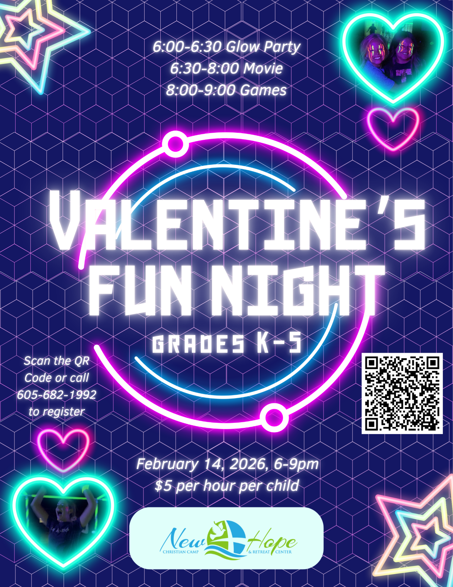 Parents, are you looking to have a night out on Valentine's Day? Send your kids to New Hope for the evening! We will be having a fun night filled with activities, like a glow party, a movie, and games! The fun night is available from 6-9pm for kids in Kindergarten through 5th grade. Please RSVP if you plan to come!